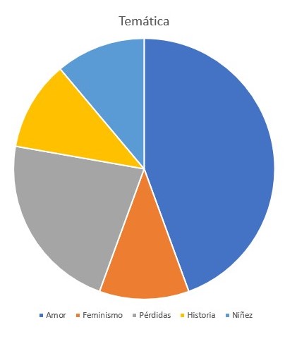 De su próxima publicación, La Princesa,destacamos temas como el feminismo y su historia, sin embargo, su obra completa está repleta de temas tópicos en la poesía pero dados una vuelta de tuerca, alguno de sus temas más tratados es por ejemplo el amor desde un punto de mira adolescente o el miedo al cambio.